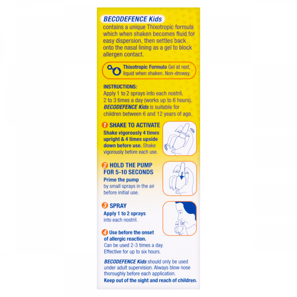 Becodefence Kids Nasal Spray provides fast and effective defence against hay fever allergy symptoms. The spray gets to work 5 times faster than traditional hay fever tablets. It helps to stop the allergic reaction as soon as the initial symptoms start., so you can enjoy the great outdoors without hay fever holding you back. The gentle formula is drug and steroid free and is suitable for children aged between 6 and 12 years old, including pregnant and breast-feeding women. If you’re looking for a quick hay fever prevention to help defend your child against irritating hay fever symptoms, try Becodefence Kids Nasal Spray.
