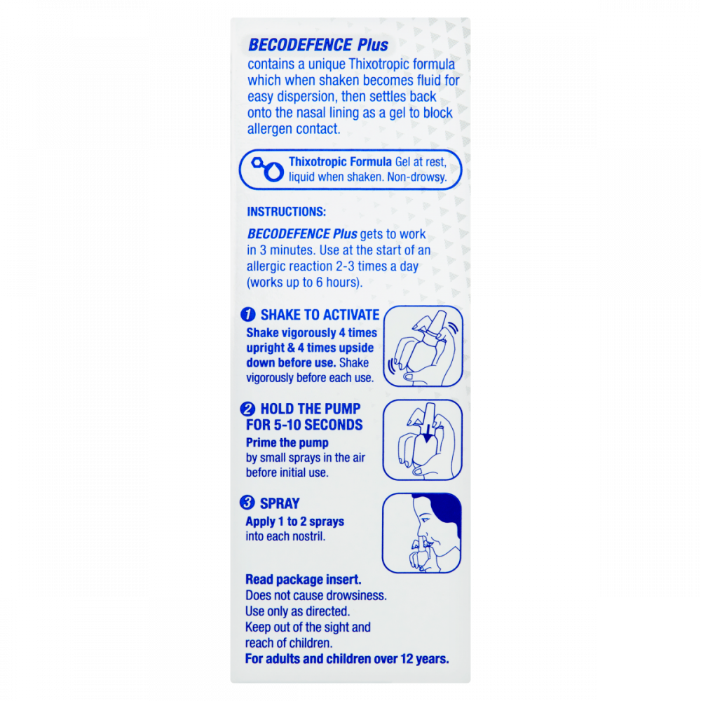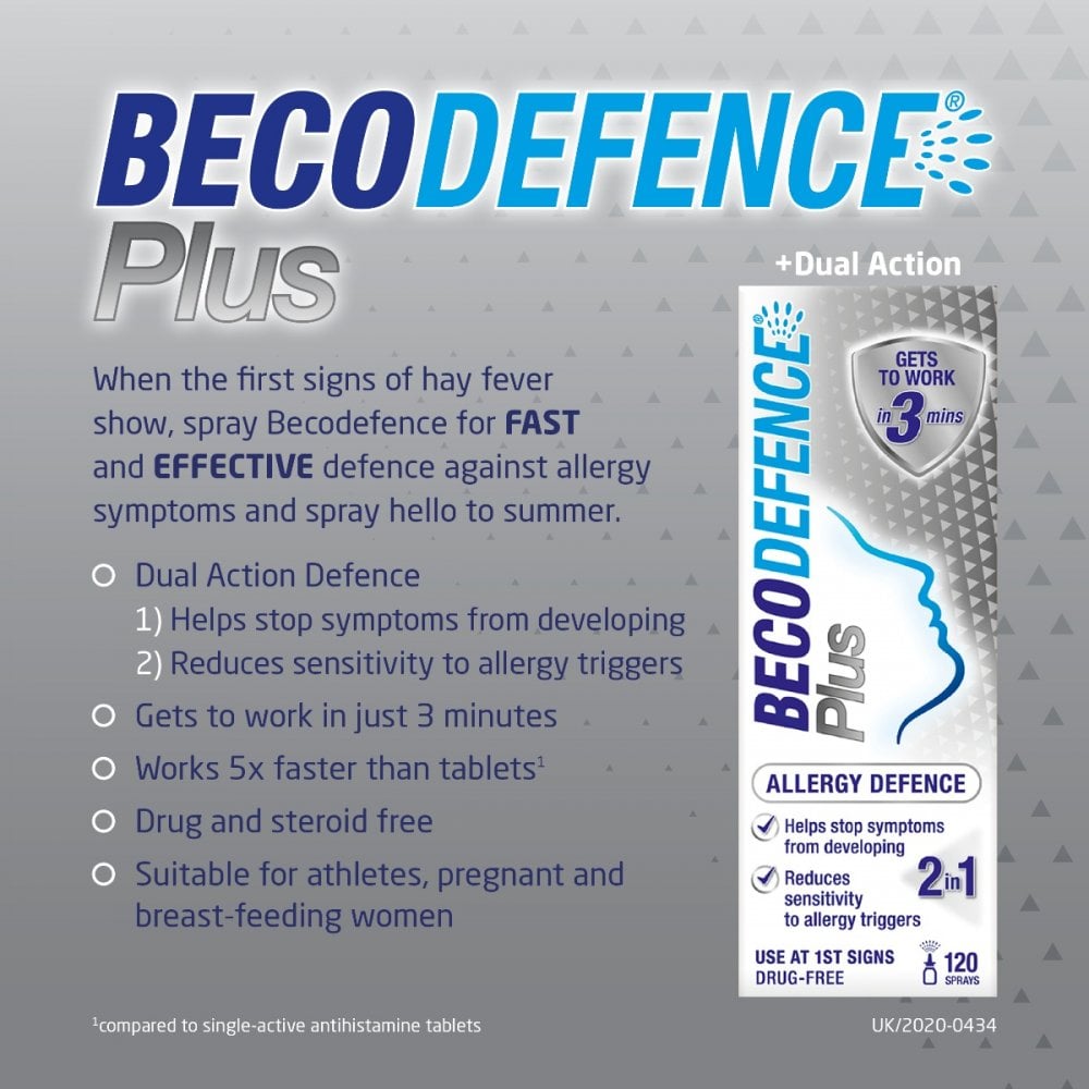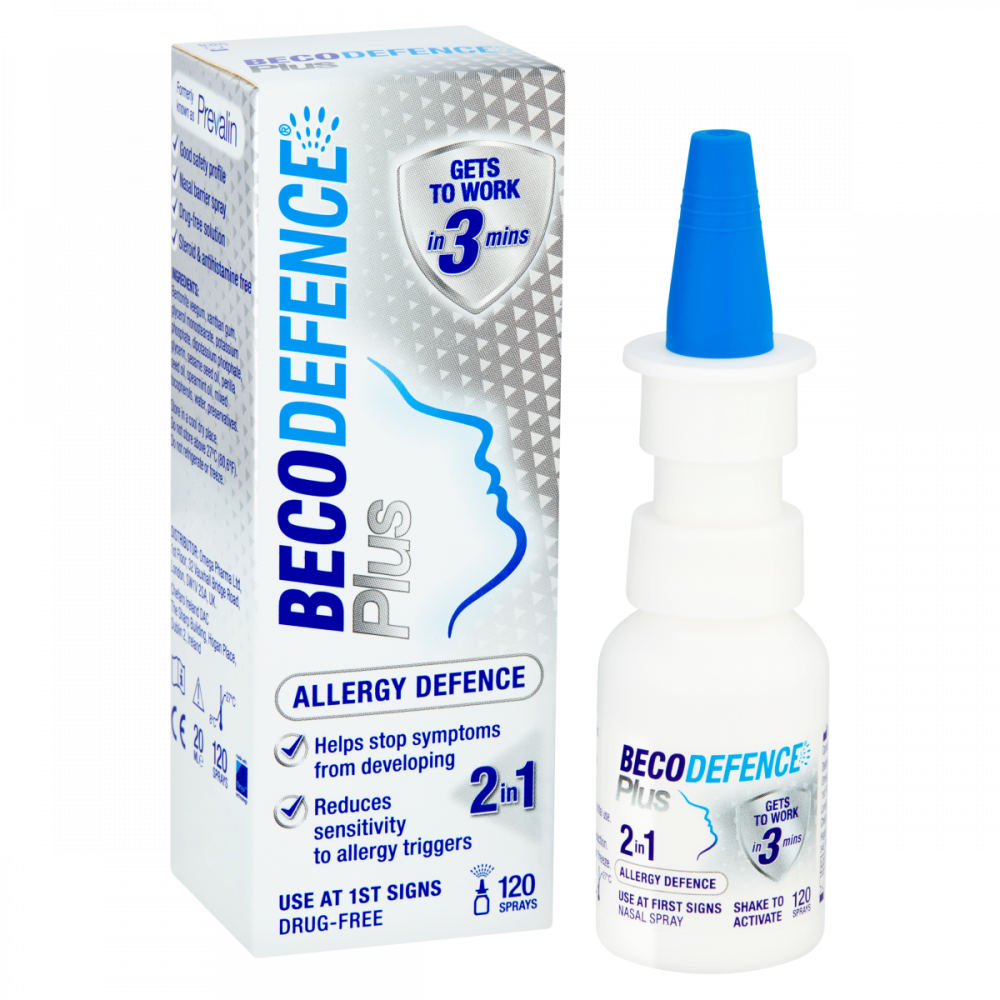 Becodefence Plus provides 2 in 1 defence against allergy symptoms by preventing them from developing and reducing sensitivity to allergens. The formula is fast and effective, as it gets to work in just 3 minutes, which is 5 times faster than traditional hay fever tablets. Becodefence Plus can be used for hay fever, dust mite and pet allergies. It contains a patented combination of oil and emulsifiers which stop allergy symptoms and provides protection against nasal allergens. The gentle spray is drug and steroid free and is suitable for adults and children over the age of 12, including pregnant and breast-feeding women. If you’re looking for a quick allergy prevention product, try Becodefence Nasal Spray.
