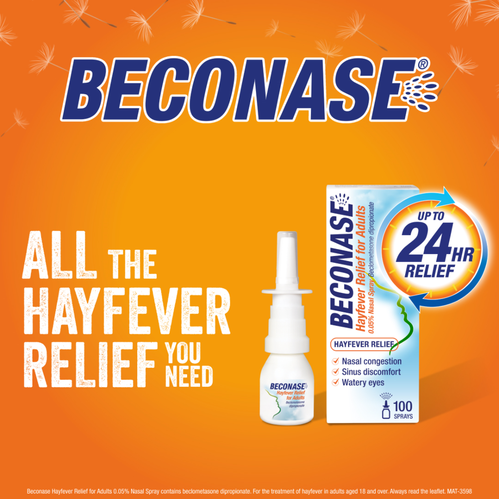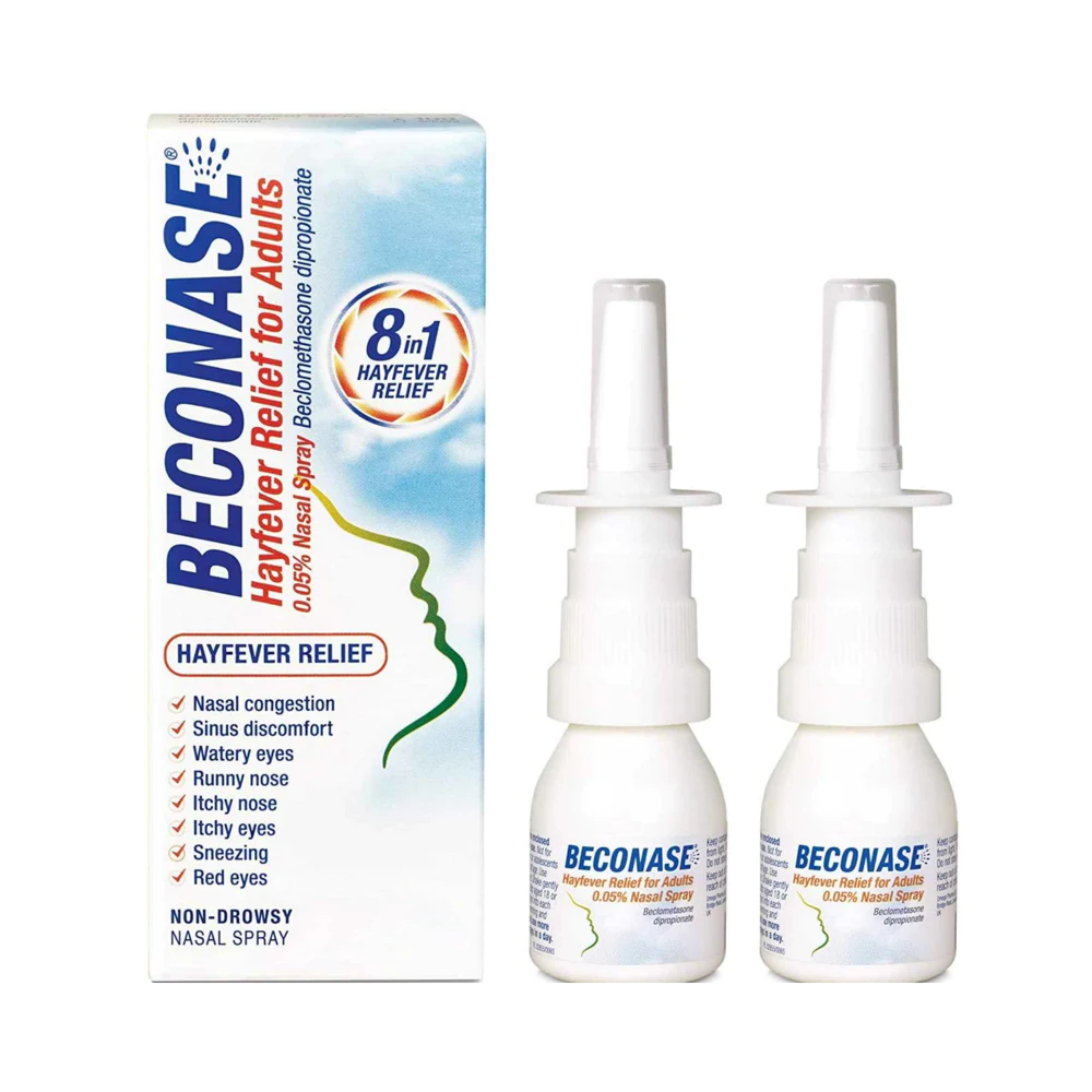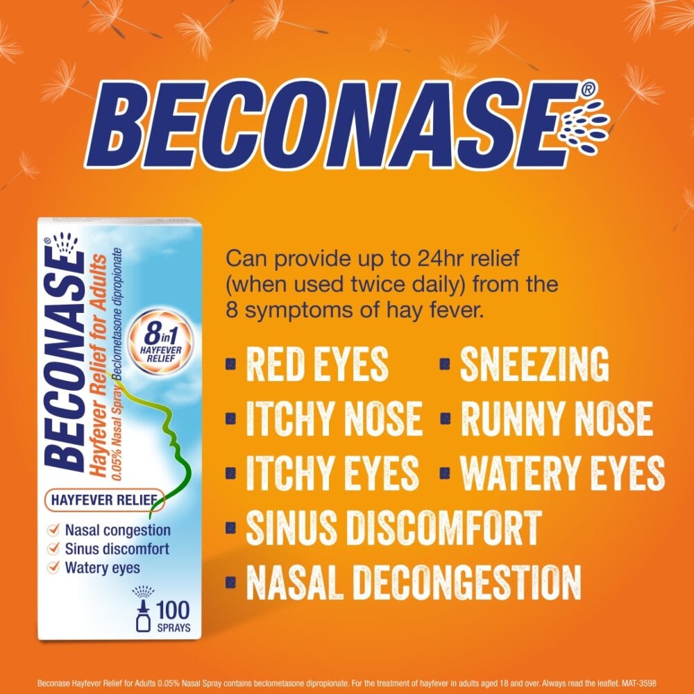 Beconase Hay Fever Relief Nasal Spray treats hay fever symptoms like sneezing, itching, and a blocked or runny nose.