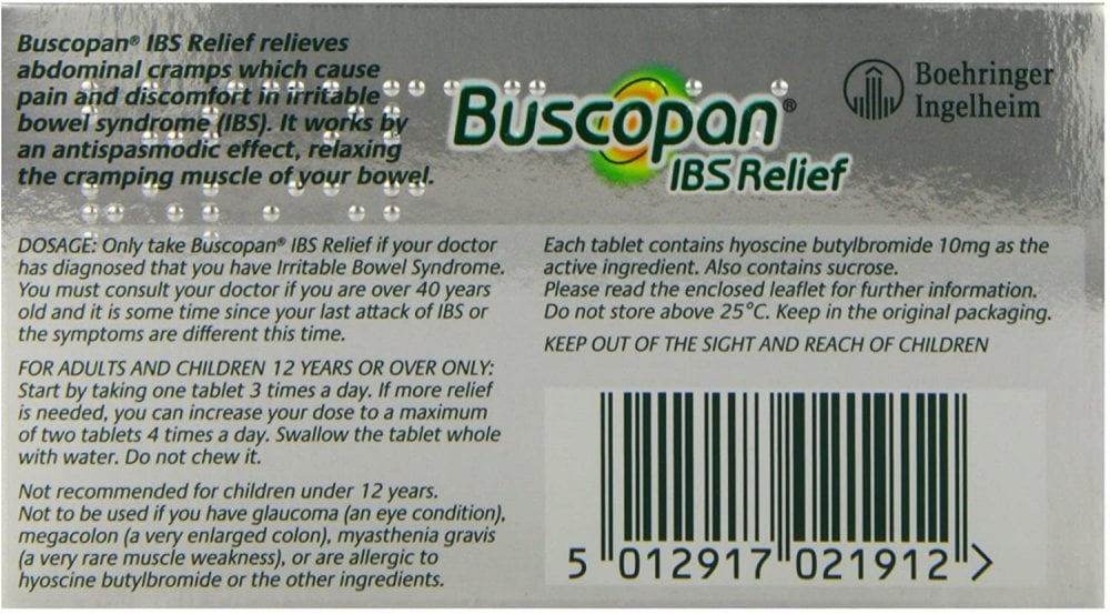 Buscopan IBS Relief tablets are not suitable for children under the age of 12. Do not use this product if you are allergic to hyoscine butylbromide or any of the other listed ingredients. Do not take these tablets if you: