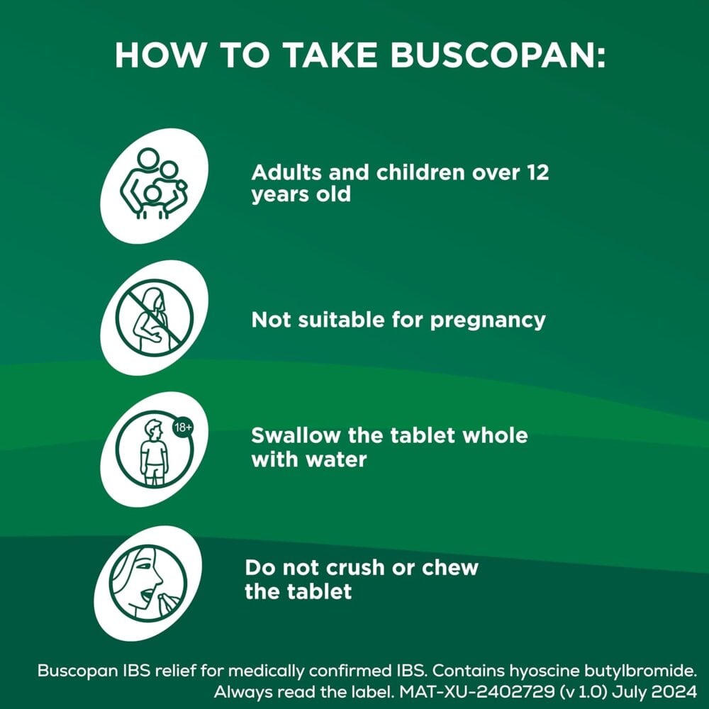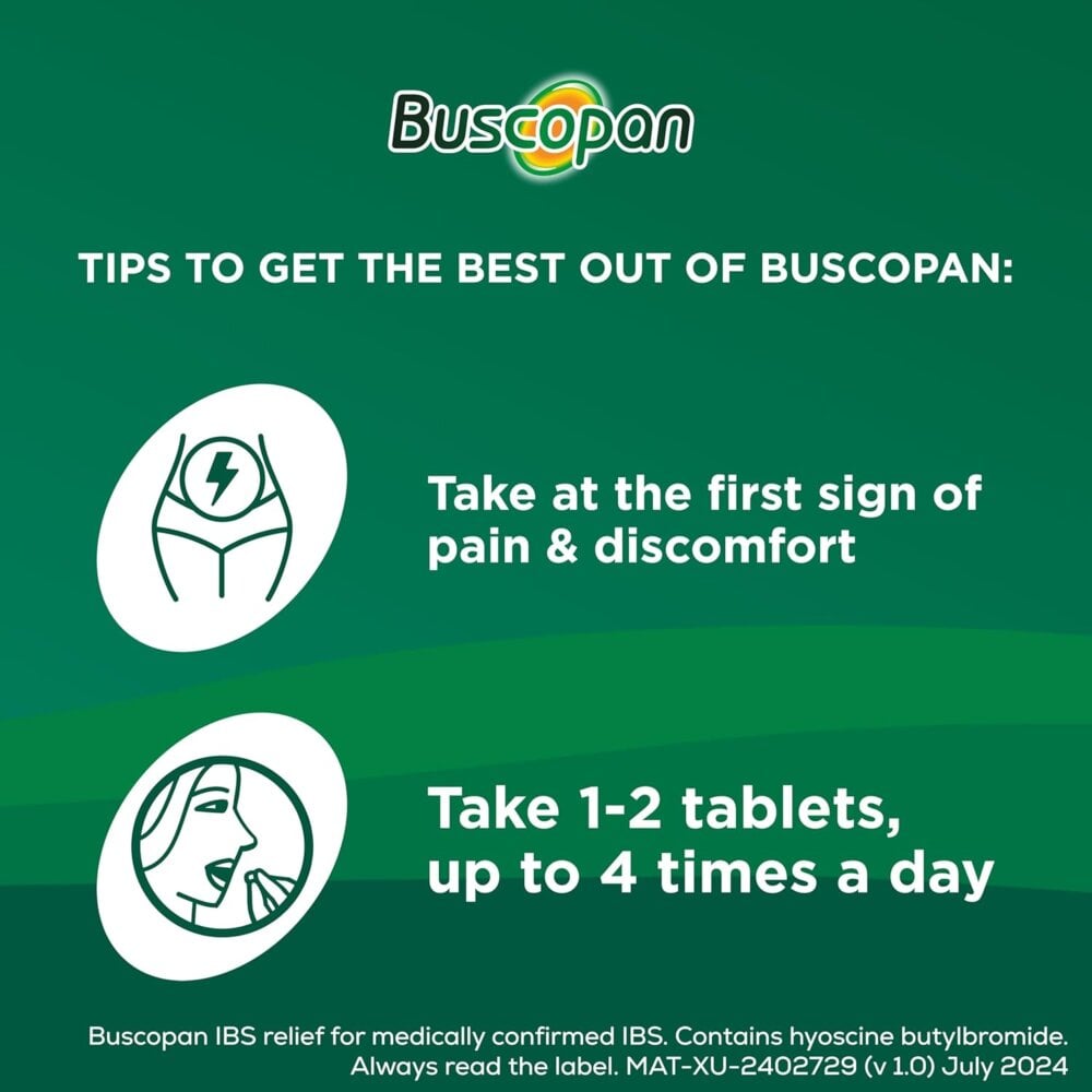 The recommended dosage of Buscopan IBS tablets is one tablet 3 times a day. If you need to, you can increase your dose to a maximum of 2 tablets 4 times a day, but do not take more than 8 tablets in any 24-hour period. Swallow tablets whole with a sip of water.
