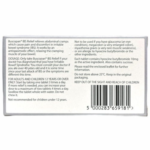 Buscopan IBS Relief tablets are not suitable for children under the age of 12. Do not use this product if you are allergic to hyoscine butylbromide or any of the other listed ingredients. Do not take these tablets if you: