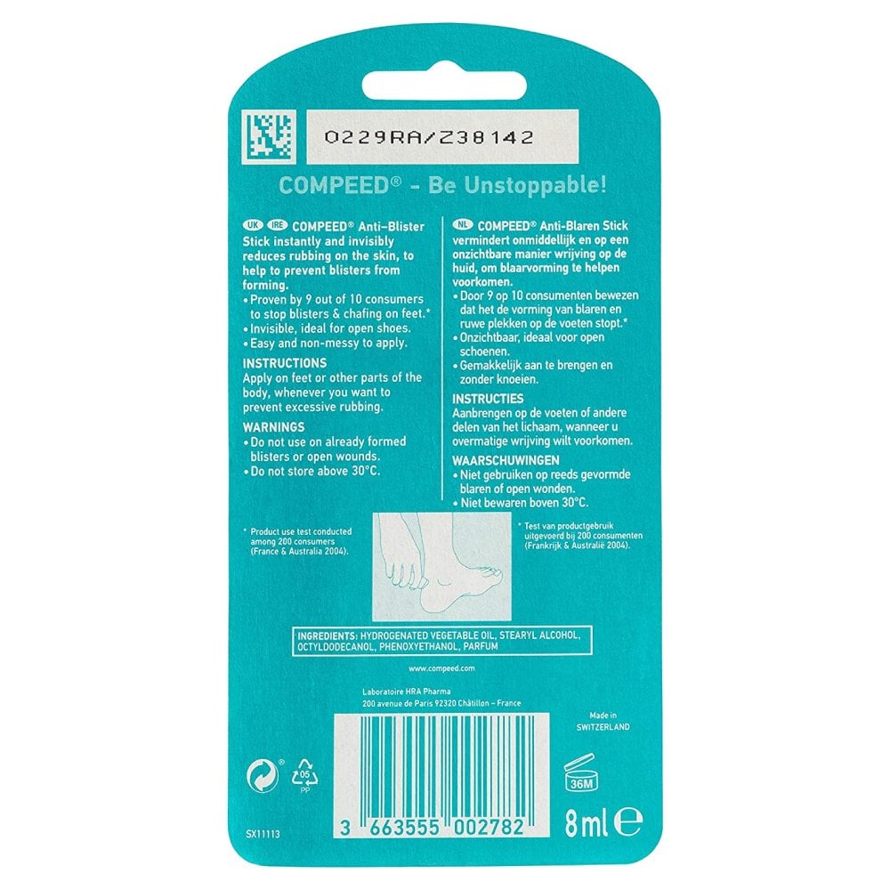 Compeed Anti Blister Treatment Stick instantly reduces rubbing on the skin, helping to prevent blisters from forming. This blister treatment is invisible, non-stain and easy to apply, making it the ideal product to keep at hand when you’re wearing new or uncomfortable shoes, or when your feet swell in hotter temperatures, making your shoes suddenly uncomfortable.