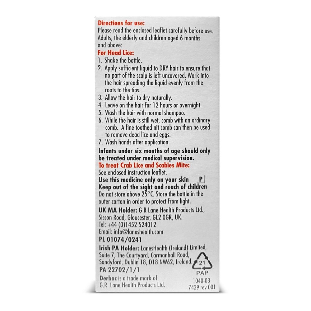 Derbac M Liquid is a treatment for head lice, pubic lice, and their eggs, as well as scabies, in adults and children over six months old.
