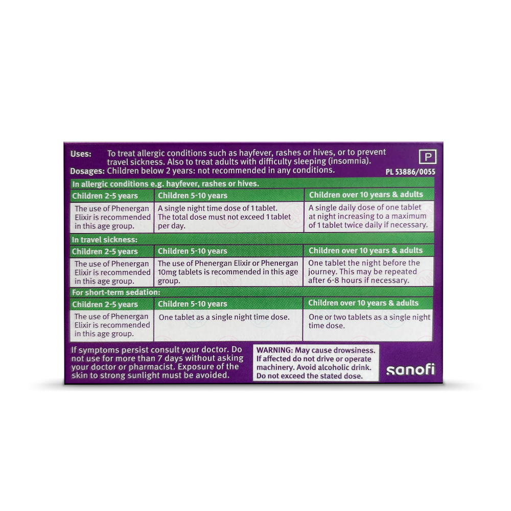 Phenergan 25mg (Promethazine Hydrochloride) tablets are designed to treat a range of conditions, including allergic reactions like hay fever and rashes, travel sickness and insomnia. As a drowsy antihistamine belonging to a group of medicines known as phenothiazines, it works by blocking histamine, the natural substance your body produces during an allergic reaction. This helps to reduce symptoms like itching, swelling and irritation. Phenergan also acts on the brain to promote relaxation, making it effective for relieving nausea caused by travel sickness and encouraging restful sleep.