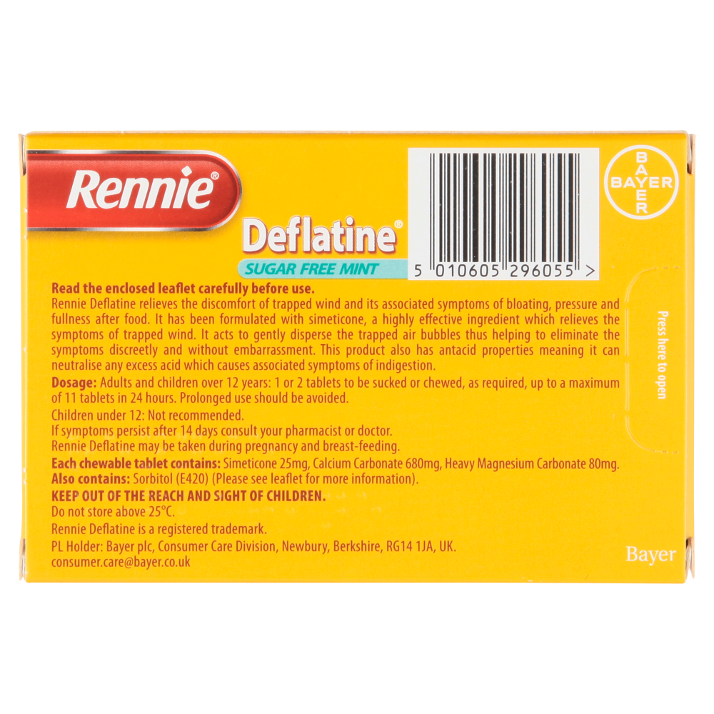 Rennie Deflatine contains sorbitol (E420). If you have been told you may be intolerant to some sugars, contact your doctor before taking these trapped wind tablets.