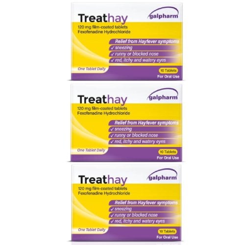 Treathay Fexofenadine is a hay fever treatment containing 120mg of the non-drowsy antihistamine fexofenadine hydrochloride. It can relieve hay fever symptoms, such as sneezing, runny nose and itchy eyes.